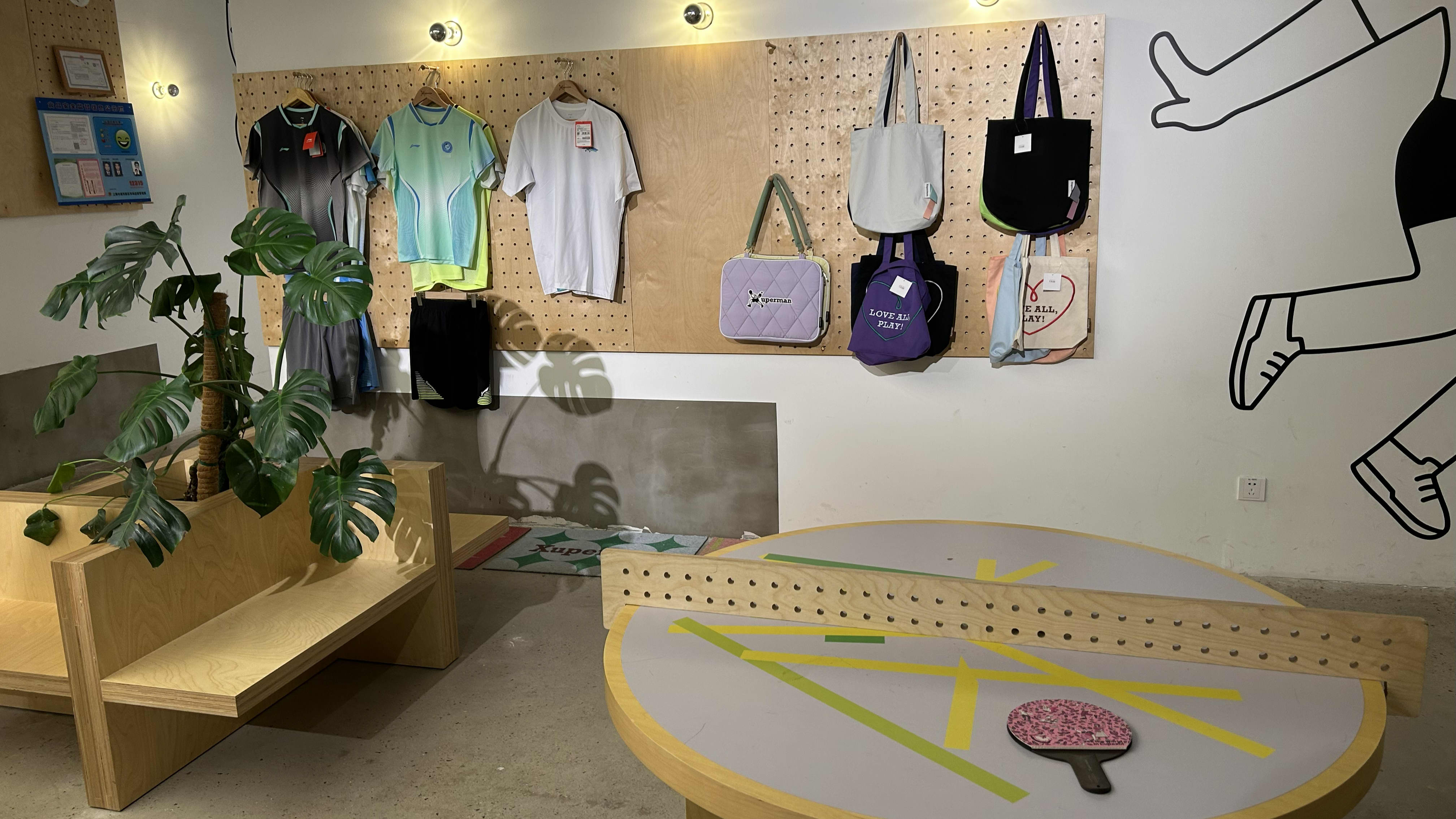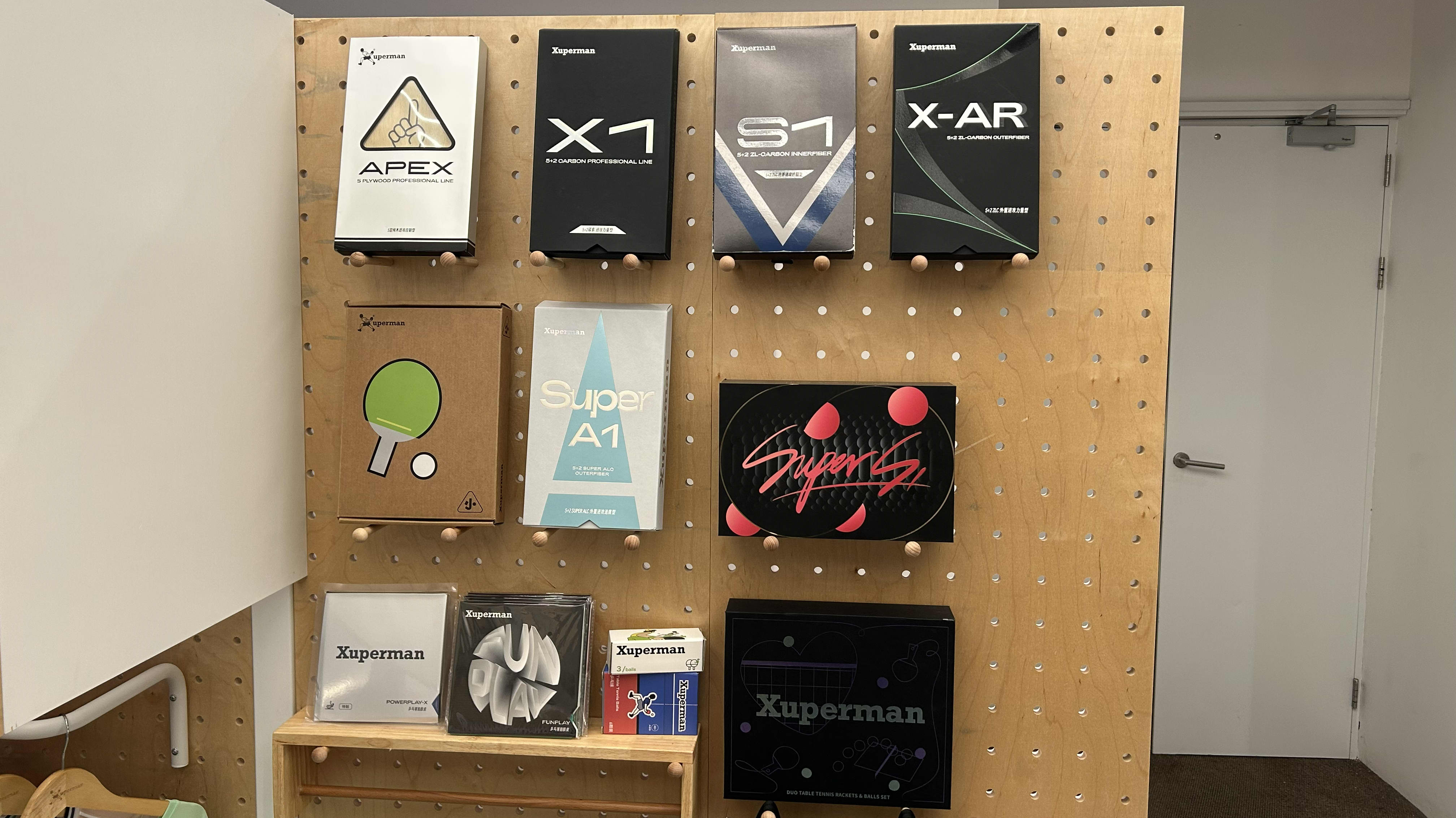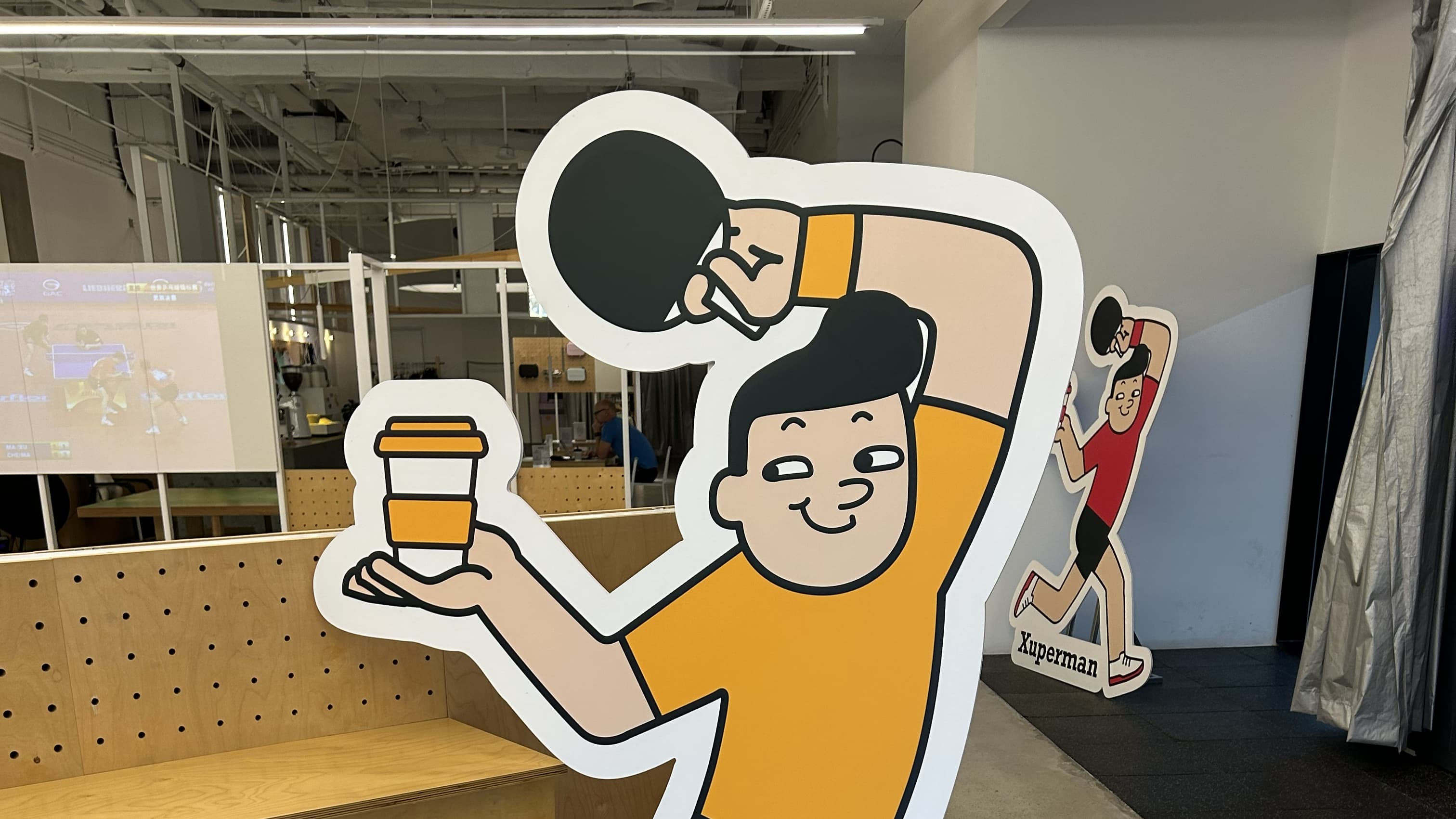 Im Café zieren die Xu-Xin-Figuren so gut wie alle Wände, bemerkenswert oft zu einem X stilisiert. Das X spielt auf den Buchstaben der westlichen Schreibweise seines Namens an, sowie auf seine artistischen Schläge, etwa seinen oft gezeigten Behind-the-back-shot. Die Schläge waren so spektakulär, dass der bekannte Kommentator Adam Bobrow den chinesischen Ausnahmespieler beim Highlight-Spiel gegen Ma Long „Xuperman“ nannte – voilà, der Name für Xu Xins eigene Marke war geboren.