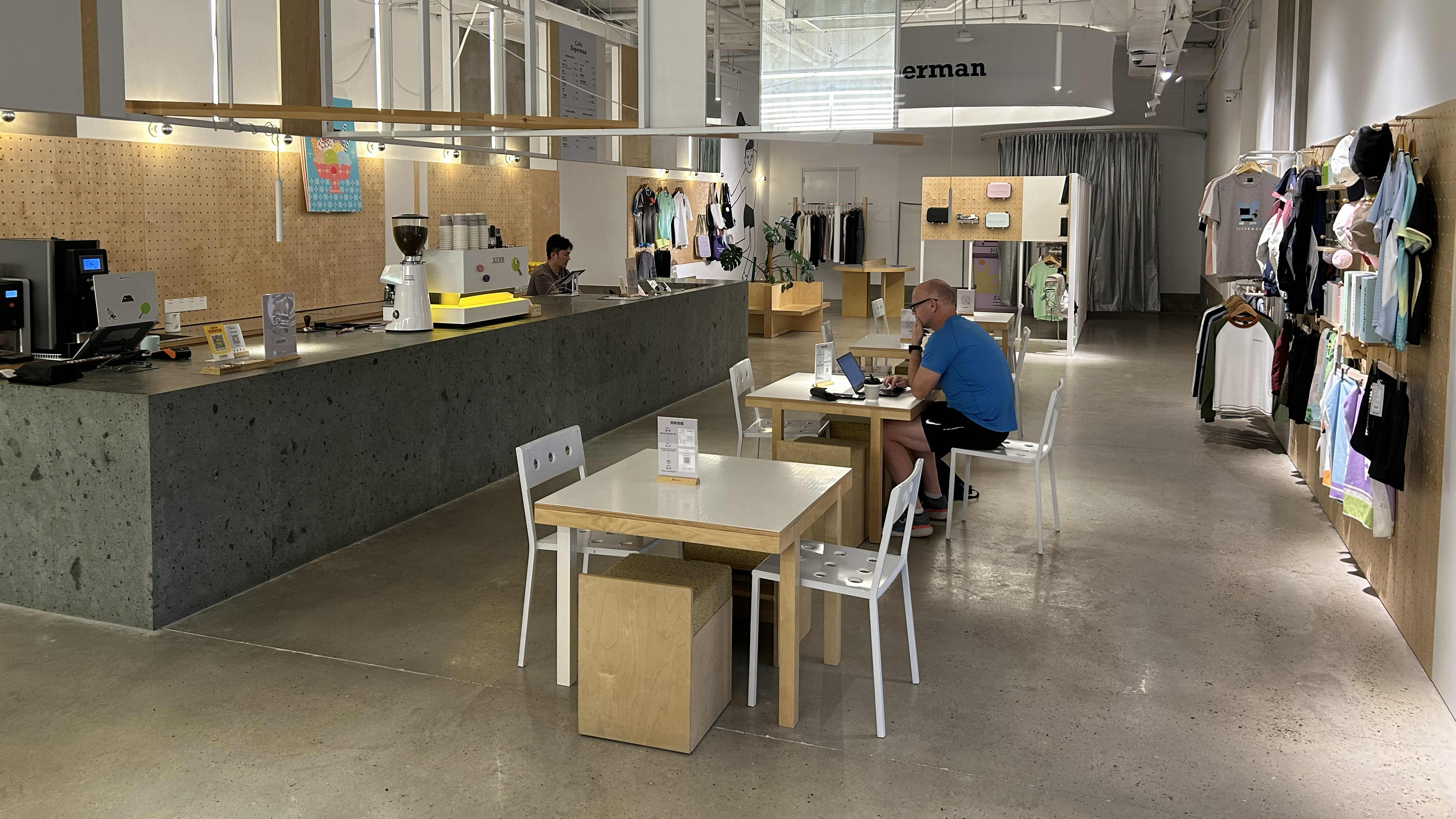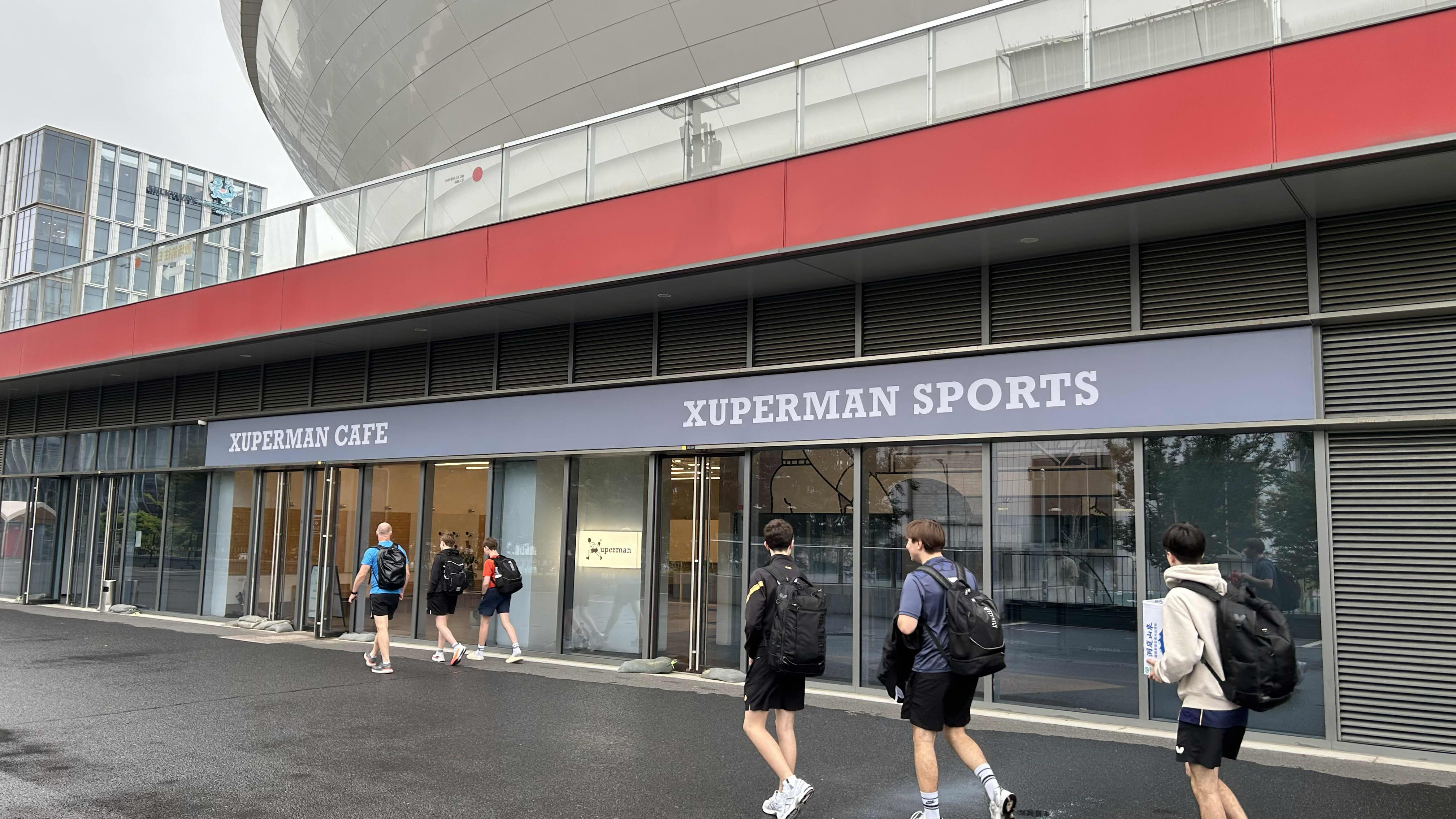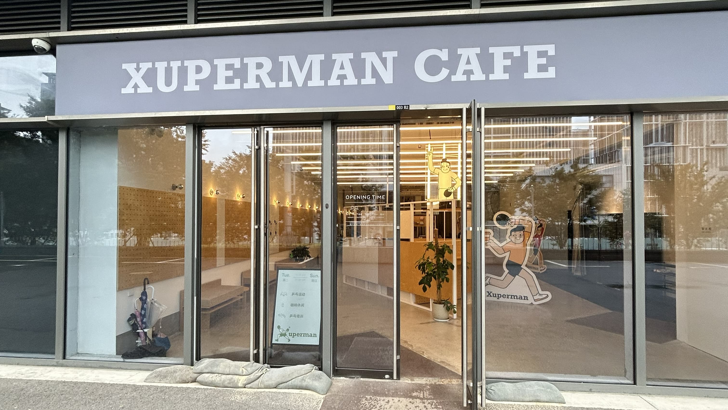 Durch die Glasfront erhascht man bereits einen Blick auf das moderne Innenleben, zwei große Leuchtschilder weisen bereits das „Xuperman Cafe“ und das „Xuperman Sports“ aus. Im linken Teil befindet sich das namensgebende Café, eigentlich eher ein Xu-Xin-Erlebnisraum, und im rechten Teil ist der Trainingsbereich untergebracht mit Tischen, Ballroboter und sogar einem Kraftraum.