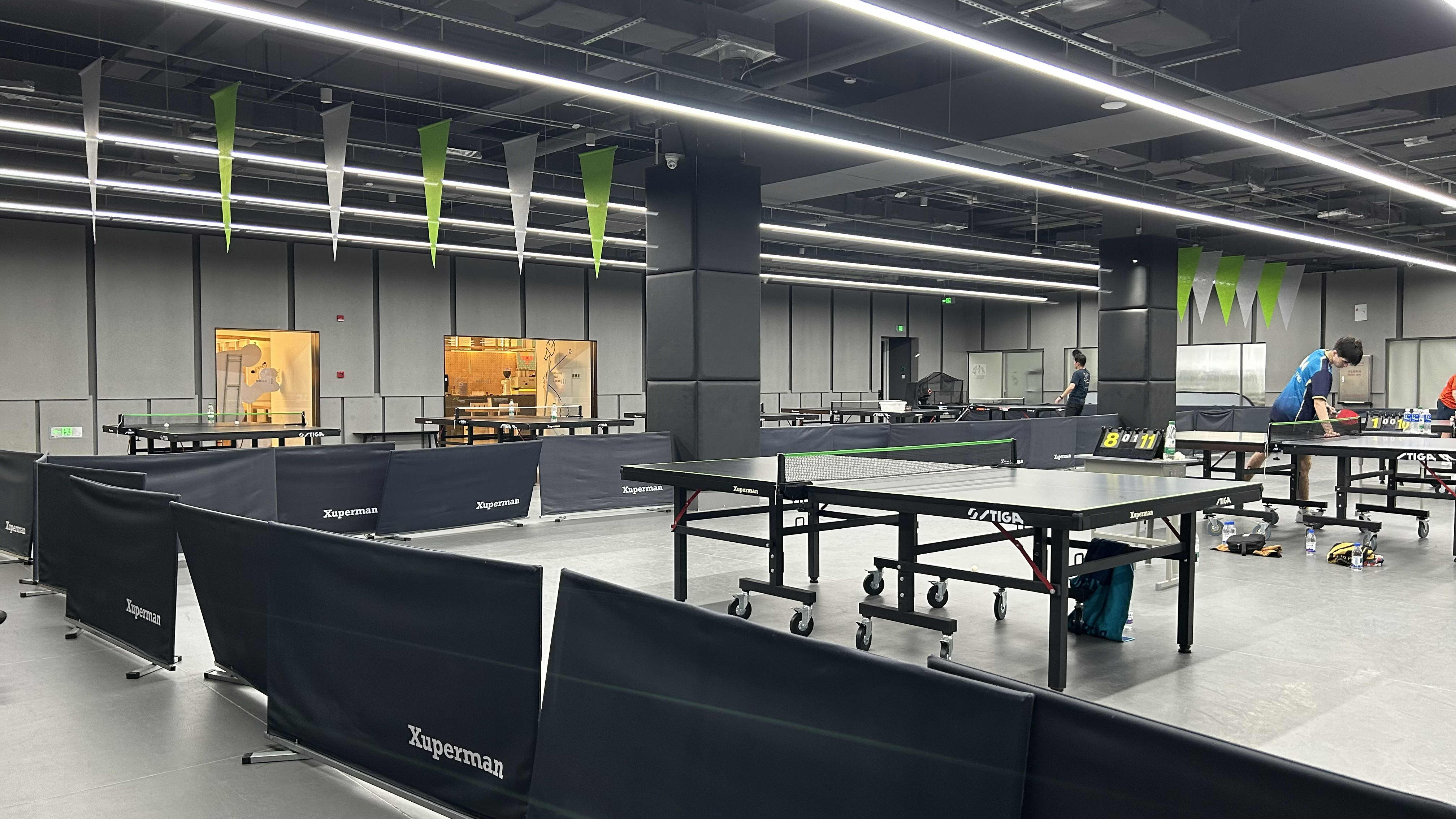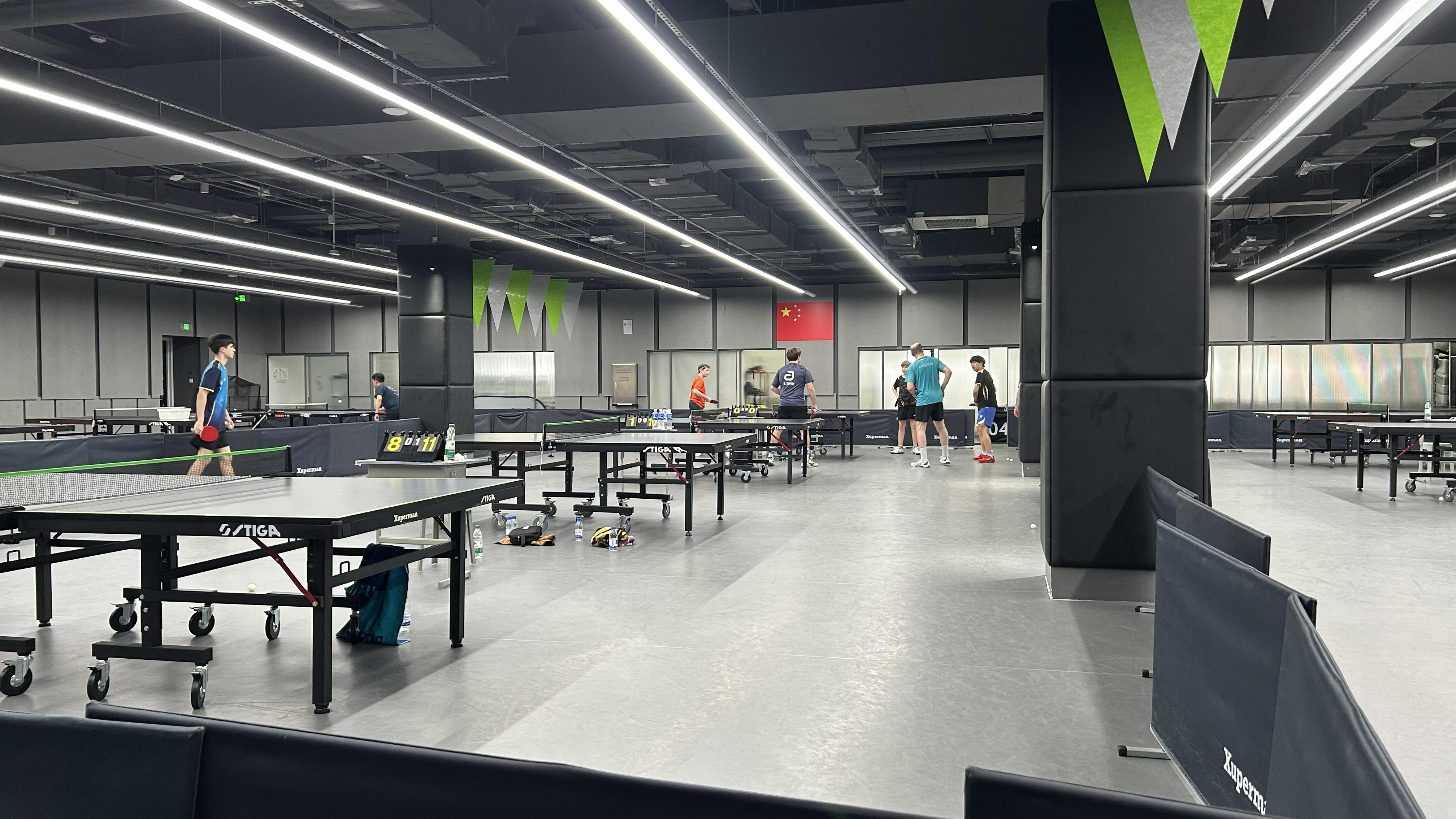 Das „Xuperman Sports“ ist fast leer, als sich die TTVN-Jungs warmmachen. An zweien der zwölf Tische spielen drei Chinesen, einer trainiert mit einem Ballroboter. Die anderen beiden – einer von ihnen wird nachher mit den TTVN-Jungs trainieren – peitschen die Bälle hin und her. Alle drei spielen (wie sollte es auch anders sein) im Penholder-Stil, wie der prominente Namensgeber für das Café.