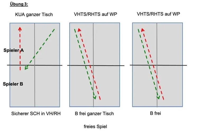 Übung 1 lässt sich auch sehr gut mit Aufschlag/Rückschlag spielen. Wichtig: Auch hier darf das Tempo nicht zu hoch sein, zumindest bis das Spiel frei ist. Gleiches gilt für Aufschlag und Schupfball.